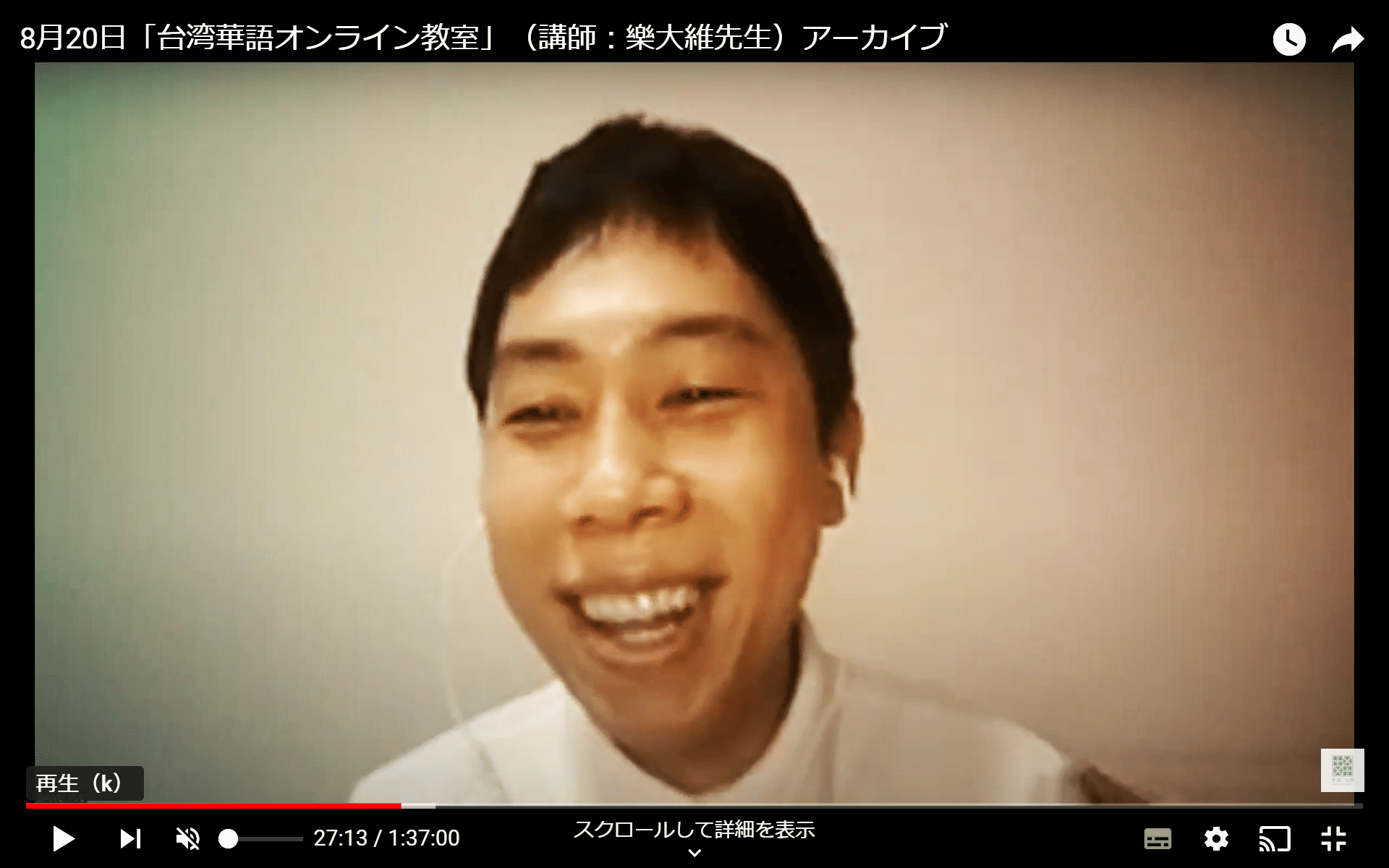 講師は、本記事でも紹介した書籍「今日からはじめる台湾華語(アスク)」「台湾華語でぐるっと台湾めぐり(白水社)」他、多数の著書を出版されている台湾華語教師・樂大維(ガクダイイ)先生。