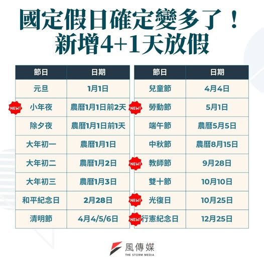 2026年 台湾の祝日(出典:風傳媒)