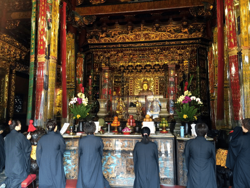 ① 前殿の三宝仏の前で、自分の住所・氏名・生年月日・職業などを名乗り、聞きたいことを口に出した後で、おみくじを引いてよいか神様に伺います。