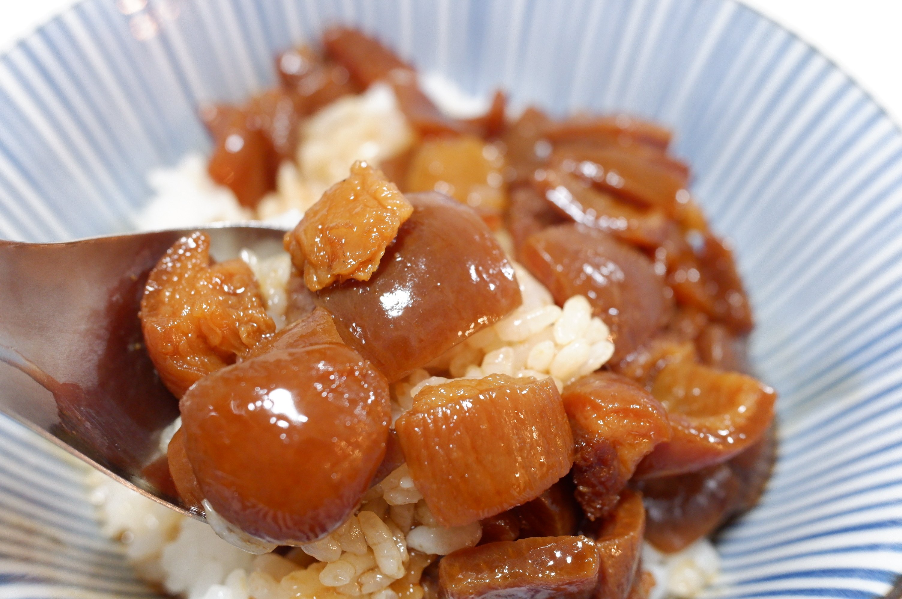 レトルト版も本店の味を忠実に再現しており、肉は脂身が多めながらも嫌な重さはなく、舌の上でほろりと崩れるような柔らかさ。口いっぱいに広がる甘辛ダレの濃厚な旨みは、まさに“台湾夜市の味”。