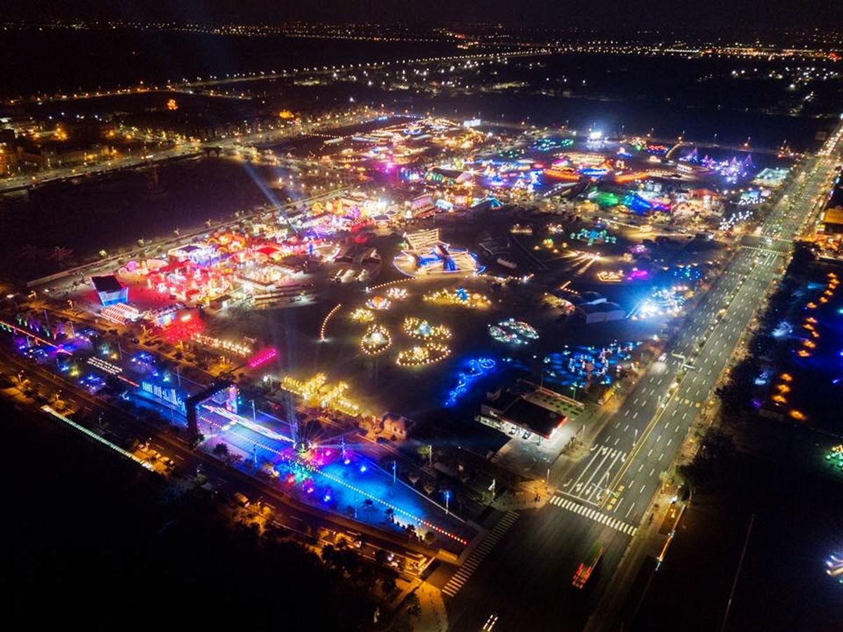 最大の特徴は、「冬の遊園地」というテーマのもと、ランタンを単なる伝統工芸としてではなく、現代アートやポップカルチャーと融合させた体験型空間として再構築している点です。巨大なメインランタンはもちろん、キャラクターをモチーフにした作品は必見。今年は日本の国民的ヒーローであるウルトラマンとのコラボレーション展示が話題となっています。海辺の開放的なロケーションにそびえ立つウルトラマンの大型ランタンは、昼間はフォトスポットとして、夜は内部照明によって赤と銀のボディが浮かび上がる圧巻の存在感を放ちます。