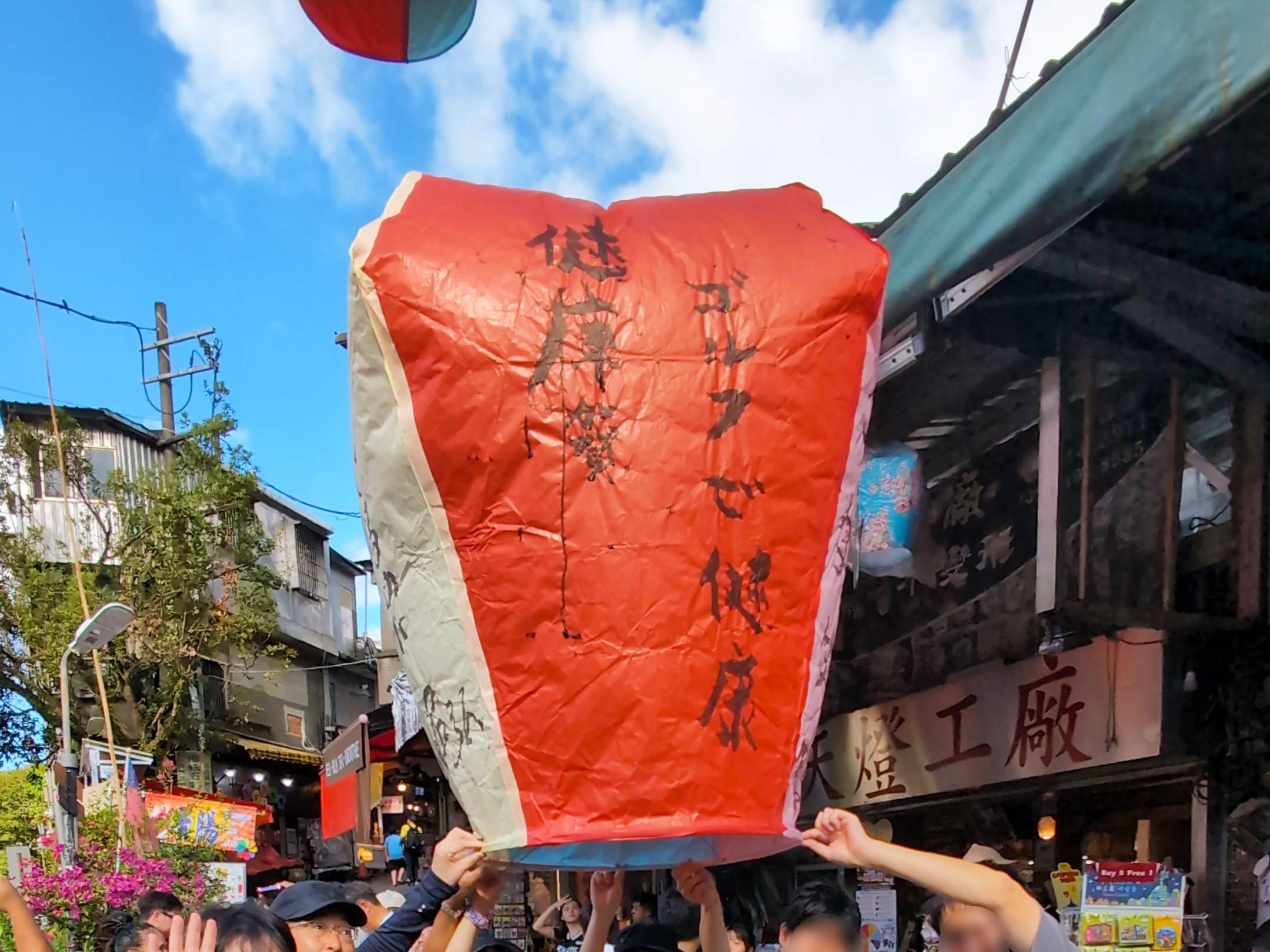 「十份」は線路沿いに広がる老街(ラオジエ/古い町並みが残る通り)を散策しながら、天燈(ランタン)上げができる名スポット。ランタンに願い事を書いて空へ放つ体験は、国内外問わず多くの観光客に人気があります。滞在時間は約1〜1.5時間が目安です。