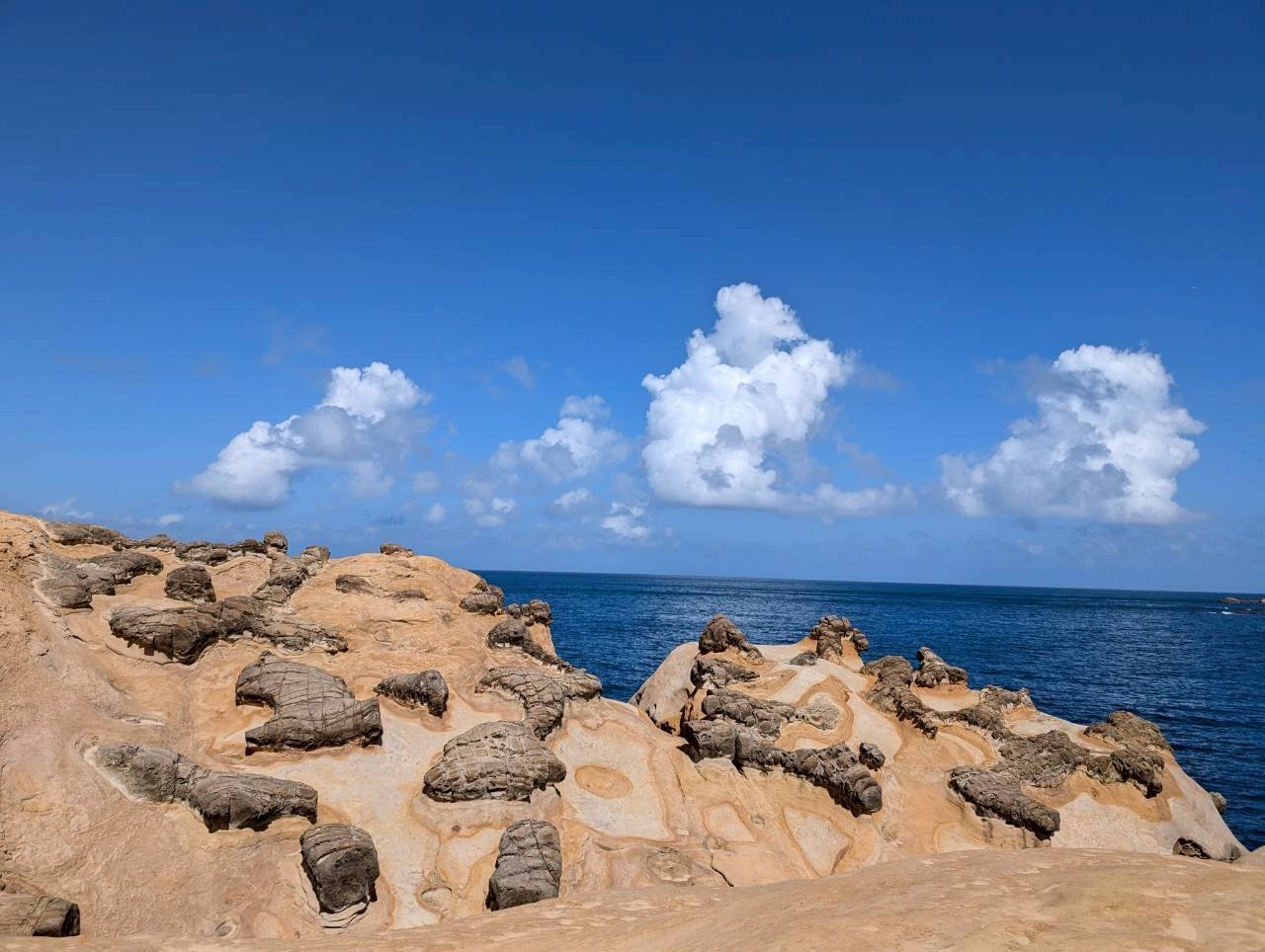 海岸沿いには、波が岩盤を削ってできた海食洞や、溝状に刻まれた海蝕溝が広がり、四角く割れた形が印象的な「豆腐岩」も点在しています。場所ごとにまったく異なる表情を見せるのも、野柳ならではの見どころです。