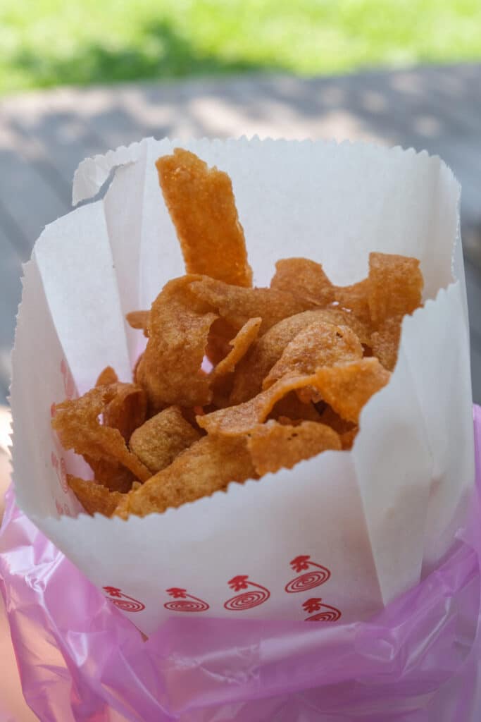 しょっぱいおやつを食べたいときにおすすめなのが、老街と交差する華中街沿いにある屋台「小上海香酥雞」で販売されている、甜不辣(ティエンブーラー)のチップスです。