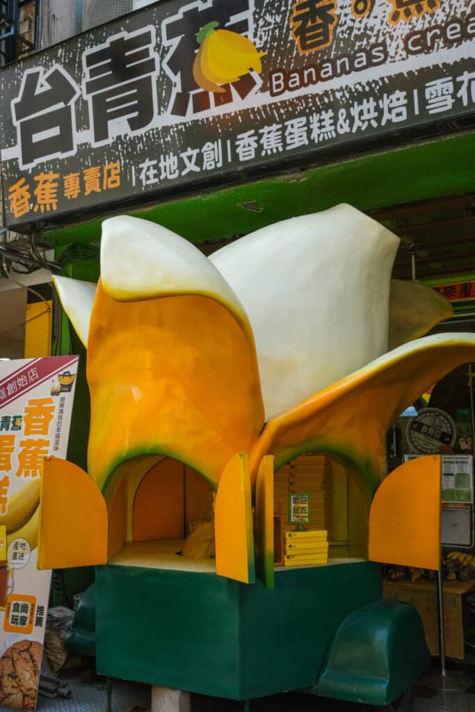 バナナの大きなオブジェが印象的な「台青蕉」。バナナスイーツの販売と店内にはカフェスペースがあります。