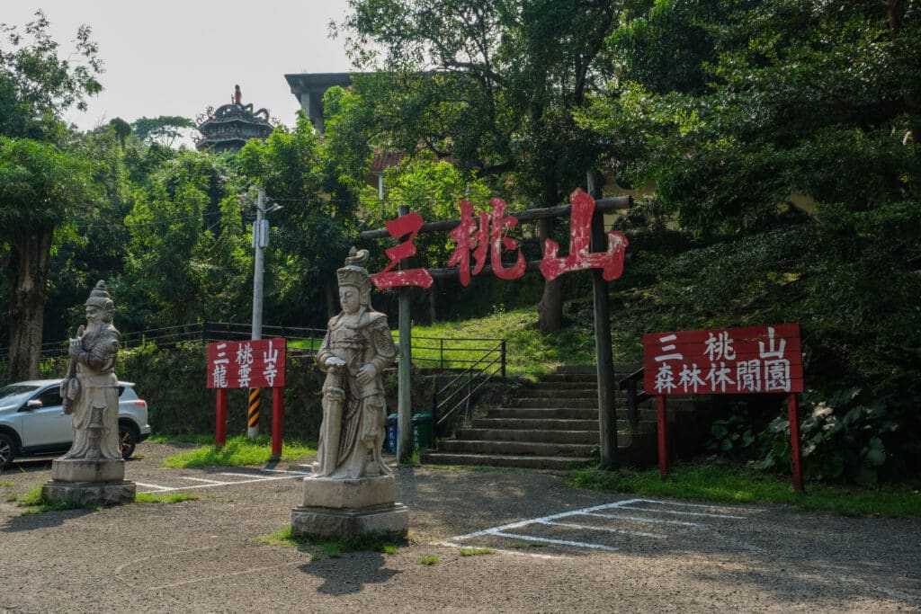 旗山老街から歩いて20分ほどの場所にある「三桃山森林休閒園」。老街を離れて住宅街を進んでいくと、徐々に山の雰囲気が感じられるようになります。登り坂の上には大きな「三桃山」という看板が。