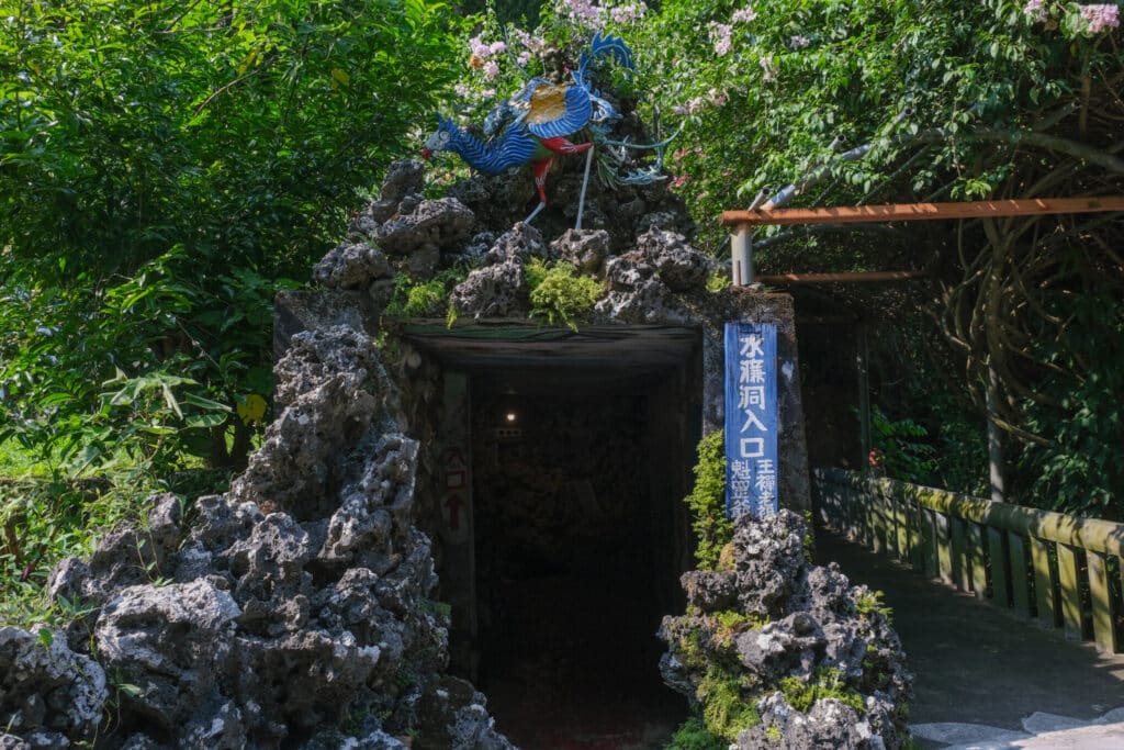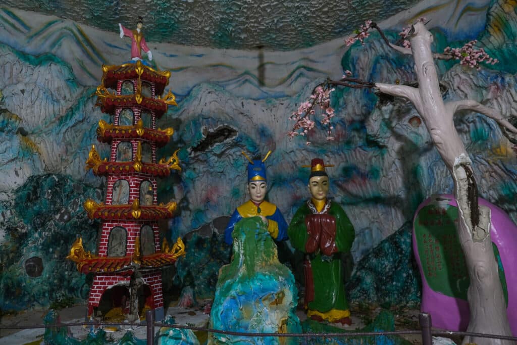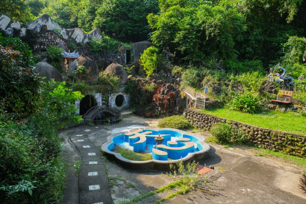 木々に囲まれる中には、洞窟も。洞窟の中はかなり狭く、迷路のようになっています。石やカラフルな像と隙間から差す光から、不思議な雰囲気を味わうことができます。