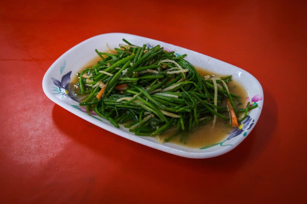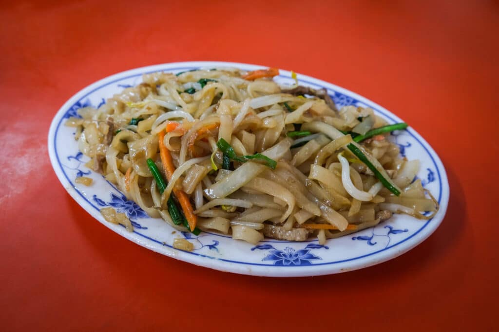 「美光粄條店」は地元の方から観光客まで、多くの人で賑わう客家料理の店です。「粄條」は、スープの中に入った「粄條(湯)」、汁なしの混ぜ麺「粄條(乾)」、野菜と一緒に炒めた「炒粄條」があります。「粄條(湯)」は、フライドエシャロットの香りともやしの食感が絡み合い、粄條の美味しさを引き立てます。「炒粄條」は、もちもち食感の麺と色とりどりの野菜、やさしい味付けのバランスが相性抜群です。