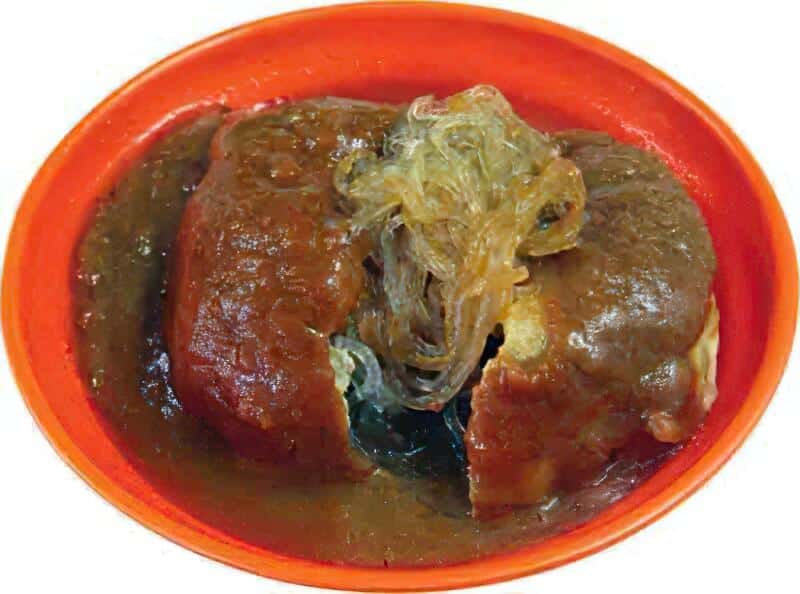 淡水名物の「阿給(アーゲイ)」は、油揚げの中に春雨を詰め、特製ソースで味付けをした料理です。一般的な食べ方は外側の油揚げをあけ、春雨とソースを絡めて食べること。ソースの辛さは好みに合わせて選べます。単品で頼んでちょっとした間食にも、魚のつみれスープを添えて満足感あるローカルランチにもできます。