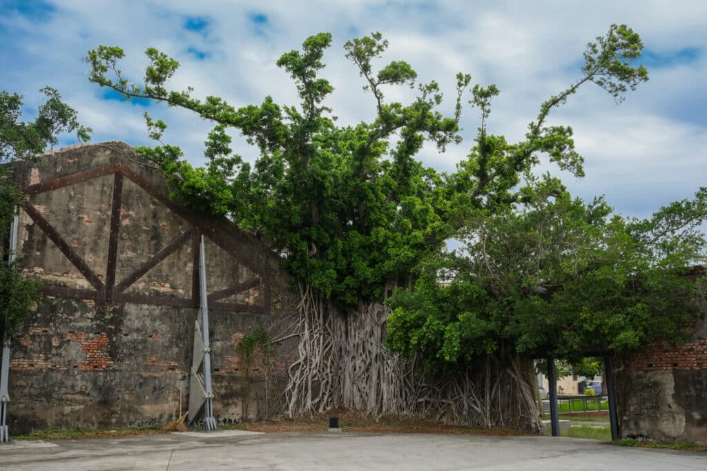 1979年に旅客輸送が終了し、2002年の工場閉鎖に伴い鉄道は廃線しました。その後、台南市政府により公園として整備されて残っています。第二次世界対戦の爆撃により天井がなくなった工場の跡も、壁面に張りついて伸びるガジュマルとともに保存されています。