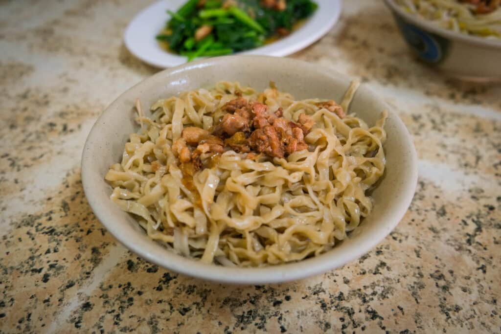 鹽水の名物といえば、鹽水意麵(イェンシュイイーミィエン)です。街にはたくさんの人気店があります。台湾式の汁なし麺である乾麵(ガンミィエン)を提供するお店が多いです。少し縮れた麺に豚肉のそぼろを煮込んだ肉燥(ローザオ)がよく絡み合います。