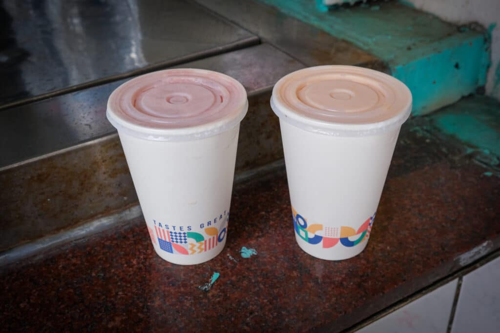 看板メニューは、西瓜檸檬(スイカレモン)のジュースです。スイカと皮つきレモンをミキサーにかけ、丁寧に網で濾して作られています。スイカのみずみずしさとレモンの酸味が混ざり合い、爽やかな味わいです。一般的なフルーツジュースは、砕いた氷や水で希釈することやシロップで甘さを加えることが多いですが、こちらのお店では滑らかなシャーベット状の氷と練乳を使用しています。