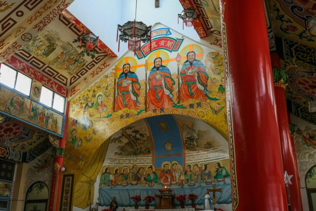 1955年頃ドイツから鹽水にやって来た神父は、街の人々が台湾語を話し、廟でお参りをする習慣を持つことを目の当たりにしました。地域や文化に溶け込むため、さまざまな試行錯誤を重ねます。そして、建物の外観から内装、壁画などの細部に至るまで中華風の様式や文化を取り入れて、このような教会が作られました。