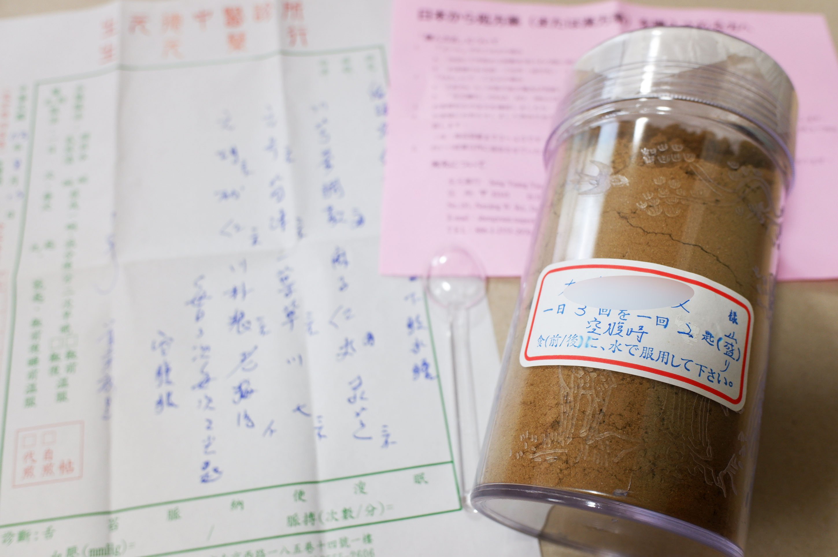 通訳スタッフより漢方薬のぎっしり入ったプラスチックのボトル(スプーン付き)と処方箋を渡され、丁寧に案内がありました。